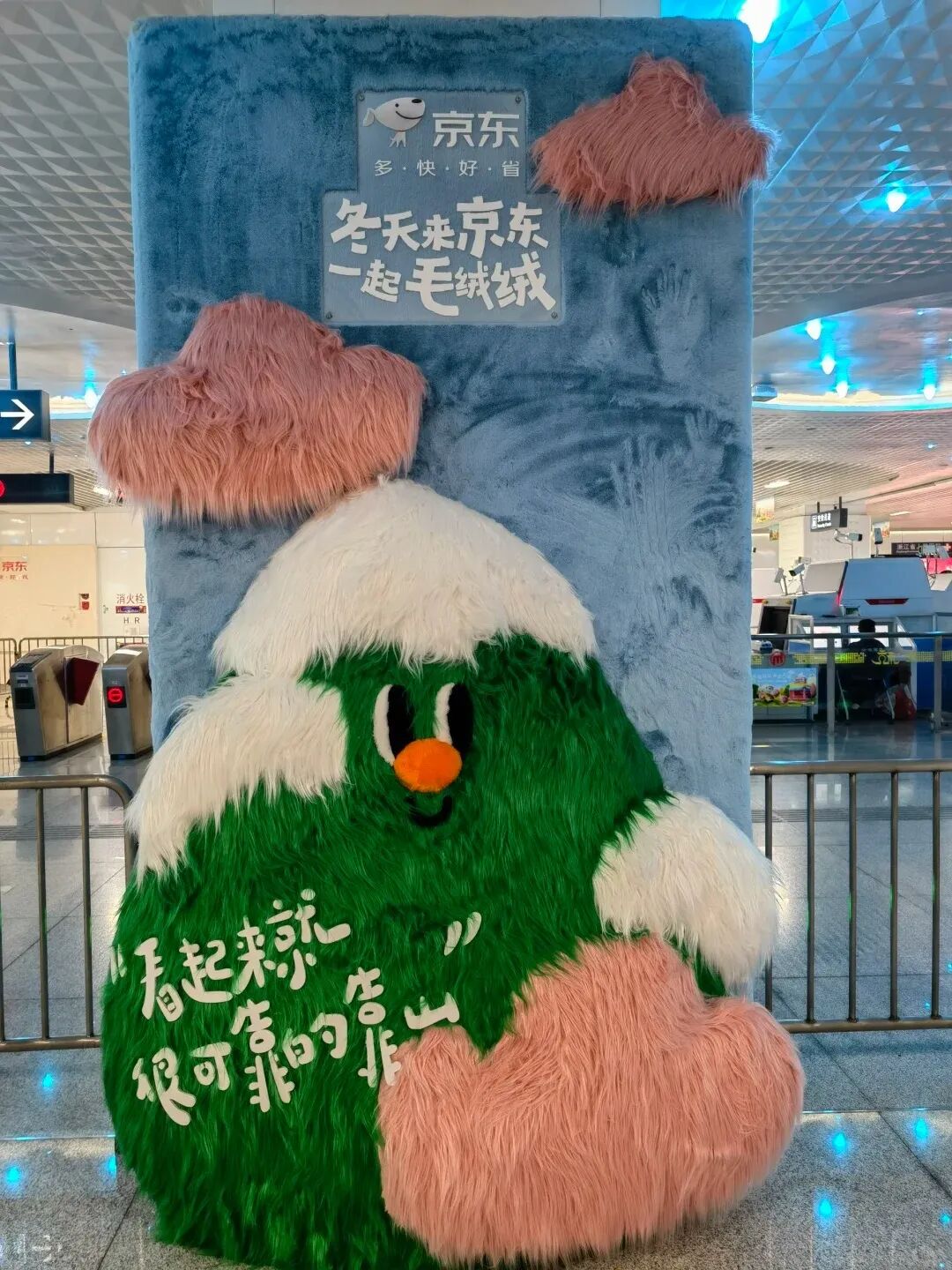 地铁站作为人们日常生活通勤中的一部分,是一个连接人们日常生活的枢纽,京东选择在人流密集的地铁站进行广告宣传,更通过创新广告形式,将毛绒绒的冬季新品直观呈现给受众,吸引了公众的目光,增加了品牌的曝光度。