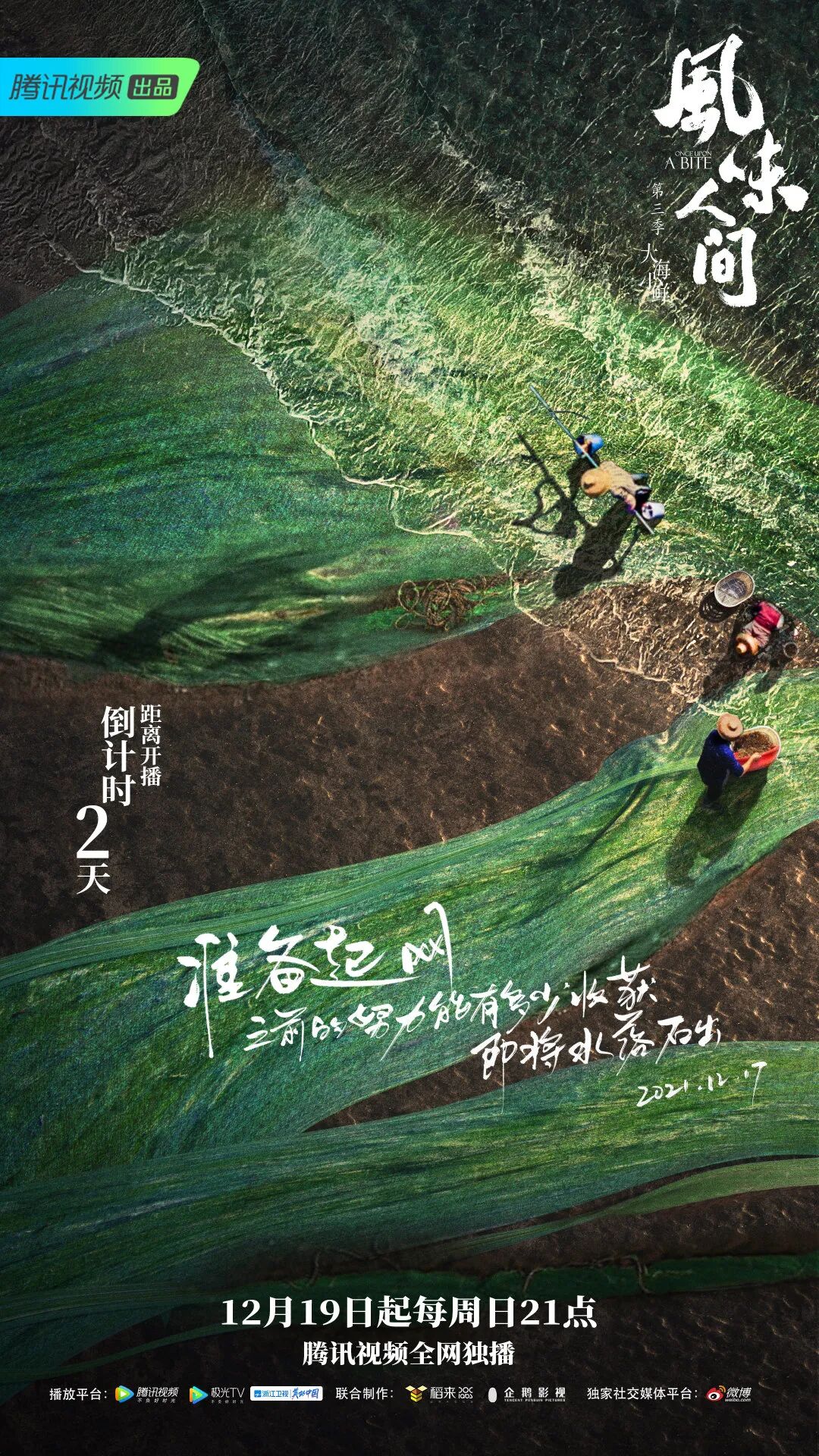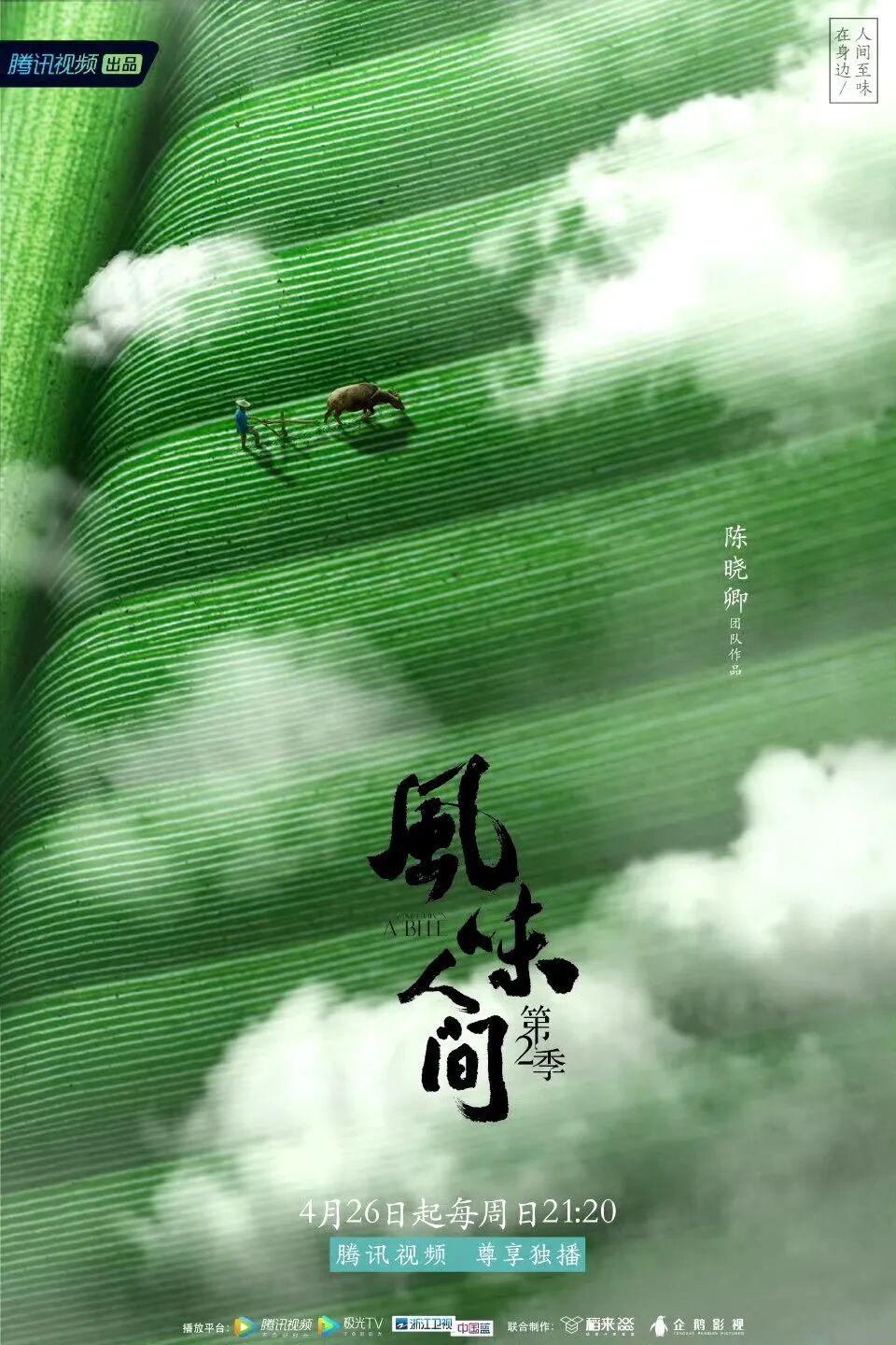 第二季的主视觉海报以微观视角,将三文鱼、芭蕉叶变为山川湖海,而耕耘劳作的人们立于食材之上,呈现一种视觉反差。