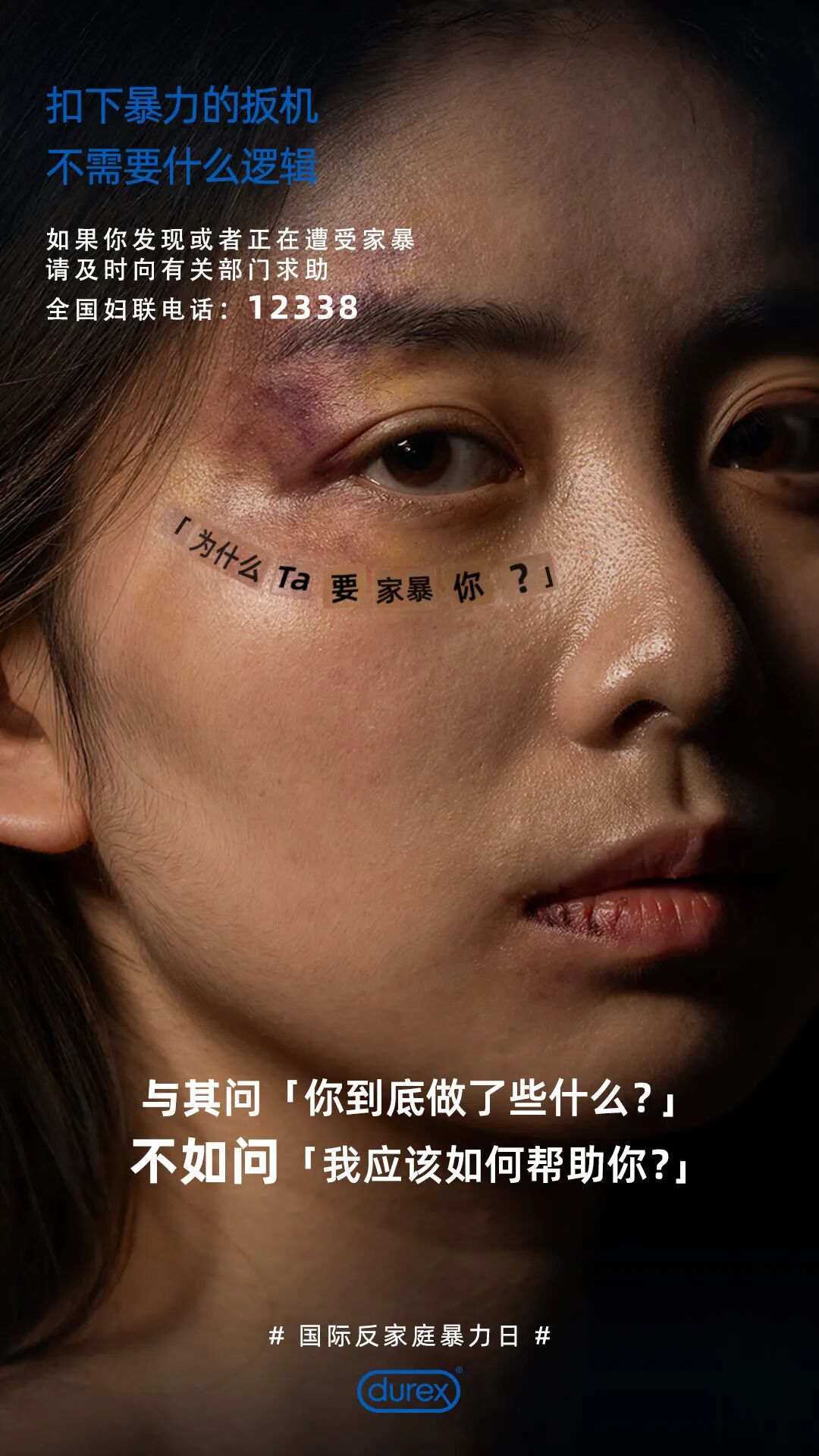 2022年国际反家庭暴力日,杜蕾斯就发布了一组震撼人心的海报,以#被质问的,从来不该是受害者#为主题,控诉家暴带来的伤害。