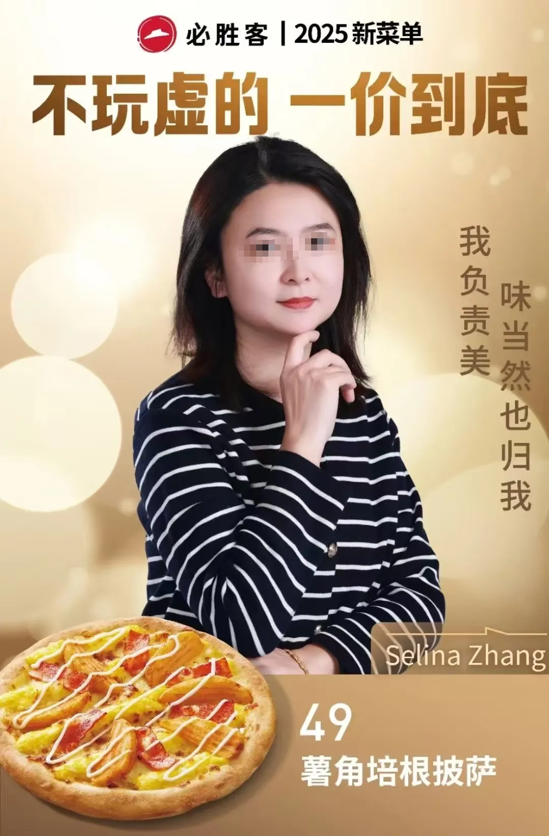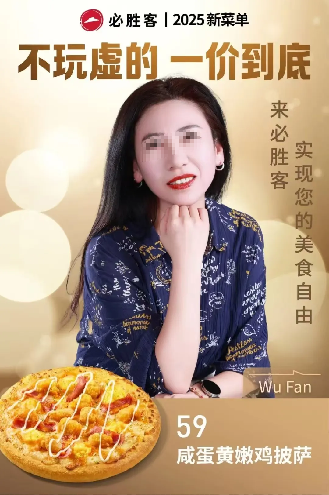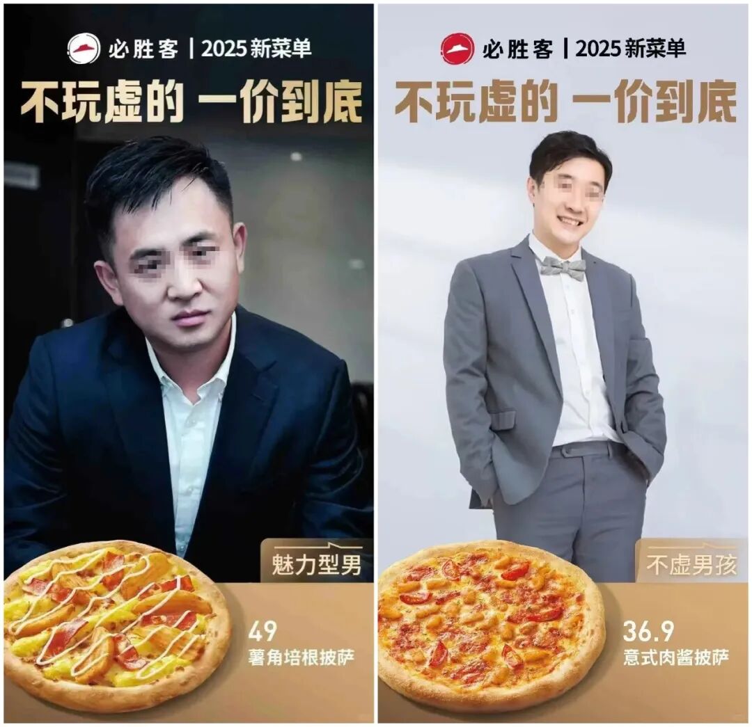 必胜客邀请高管真人出镜宣传新菜单,让员工为品牌代言,拍出了一种上交工作证图片,潦草抠图做海报的既视感。
