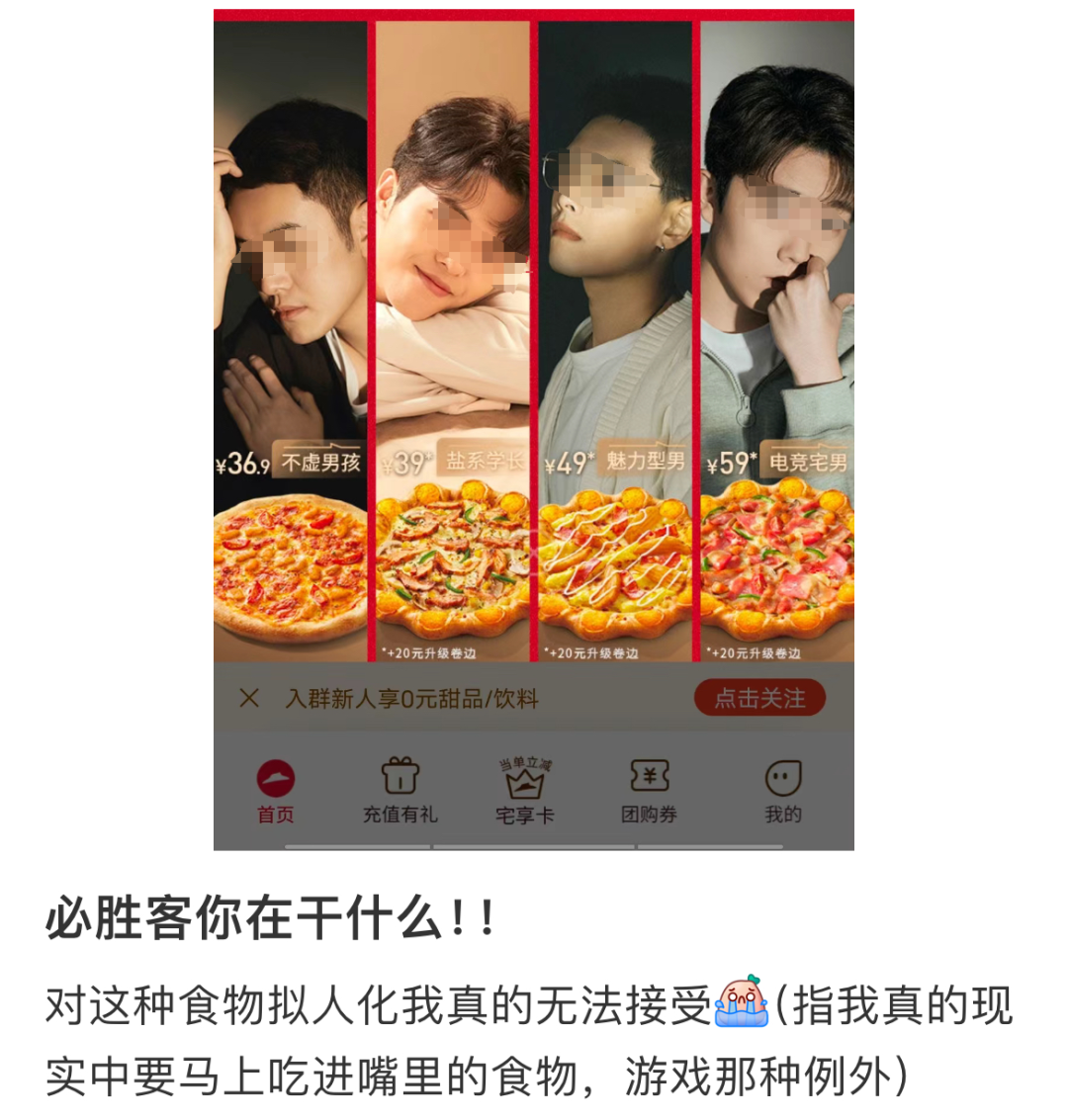 必胜客海报之所以惹争议,一是人物形象和美食品类的不适配,“美男计”适得其反,造成油腻效果。