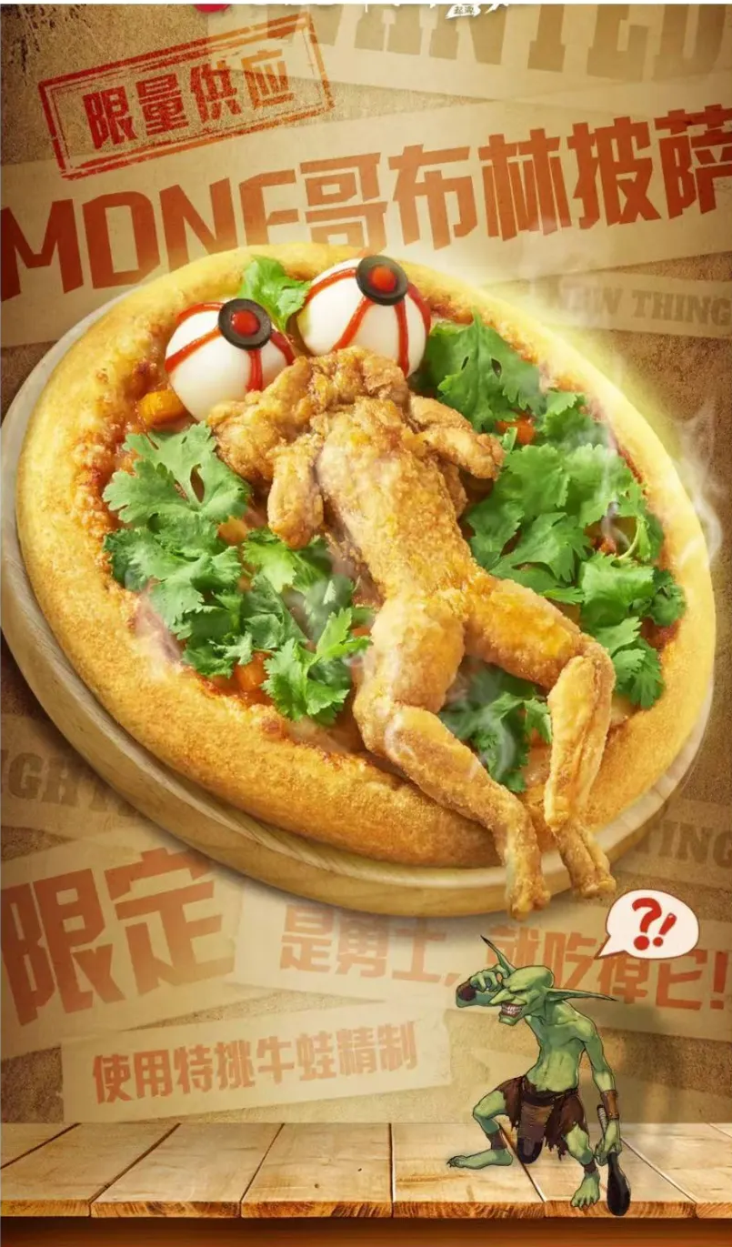 比如说,必胜客与DNF手游联名,推出了“牛蛙披萨”新餐品。