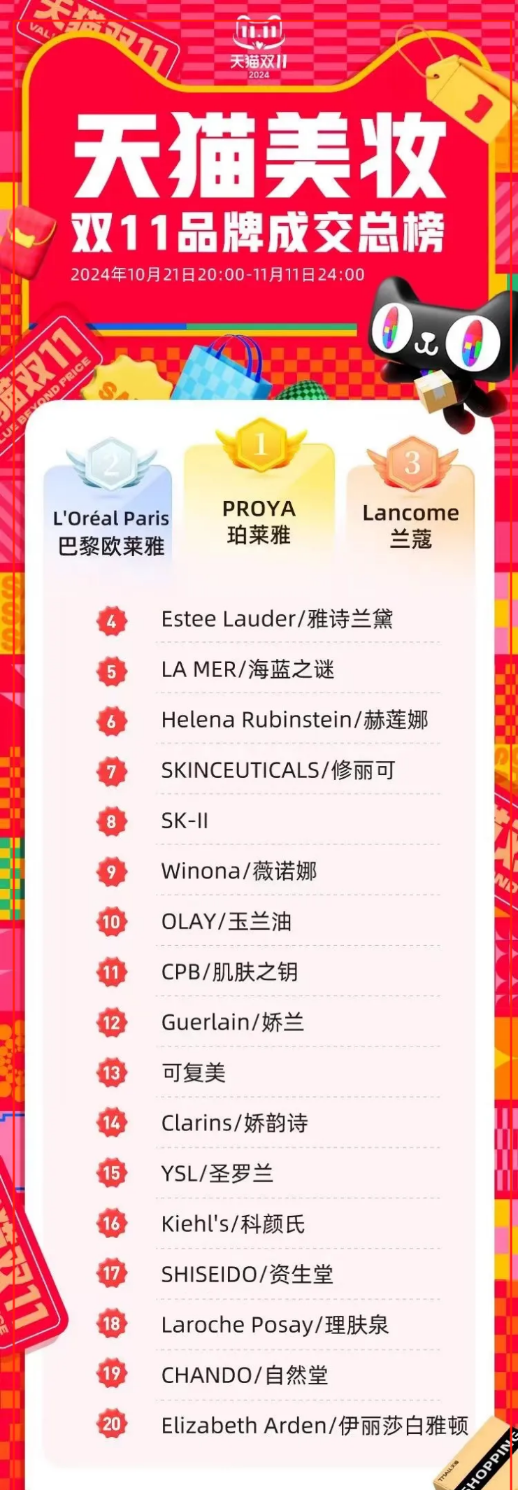 过度依赖流量的白牌们一个接一个倒了,但是有口碑的品牌却是各大美妆排行榜上的常青树,比如在今年天猫美妆双11品牌成交总榜中,都是一些耳熟能详的品牌。