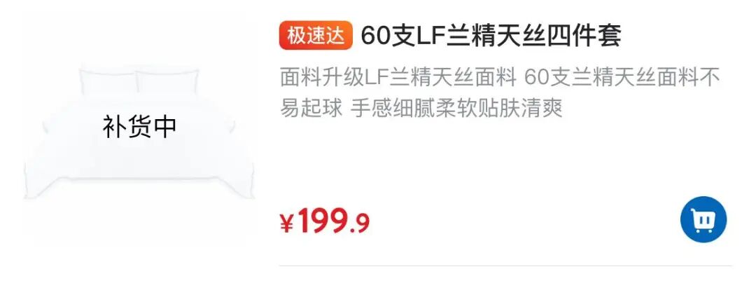 这说明山姆承认了自己的问题,根据山姆App的搜索,涉事产品因为“60支LF兰精天丝四件套”售价199.9元,目前“补货中”,产品产地为苏州。该四件套包括1件被套、1件床单和2件枕套。