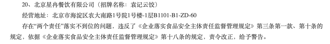 在通报中,还有招牌名称为“袁记云饺”的北京鑫鑫晟餐饮店(个体工商户)、北京星冉餐饮有限公司,均存在“两个责任”落实不到位的问题,被责令改正,给予警告。