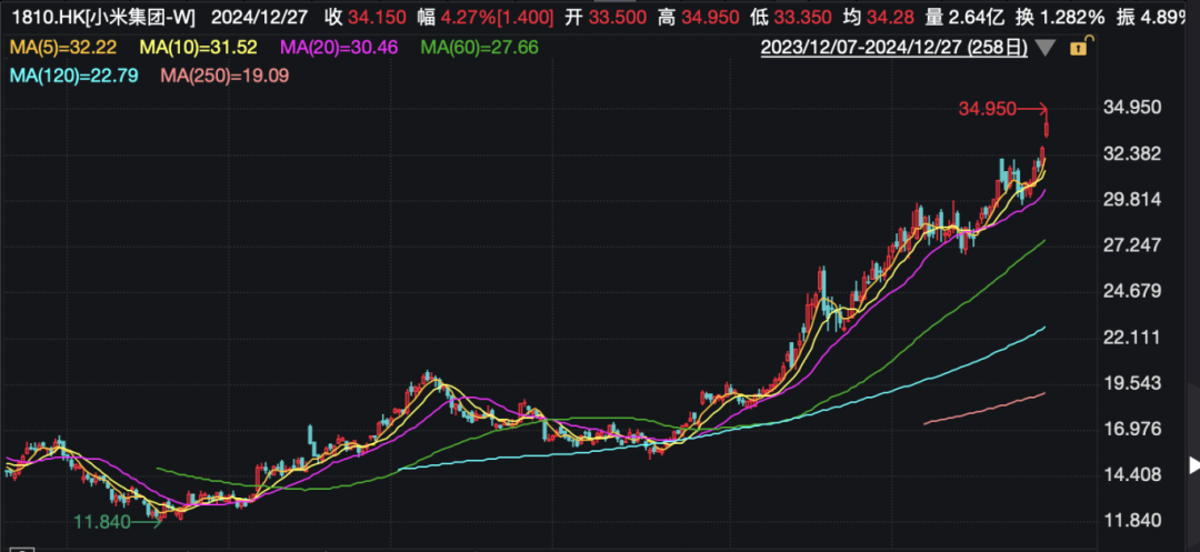 原因很简单,随着SU7的热销,不仅雷军本人得到了全民的追捧,而且自今年以来,小米股价持续上涨,累计涨幅接近120%,目前股价已逼近历史高点。