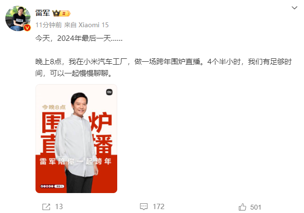 今天作为2024年的最后一天,雷军依旧心系造车,他发微博说在今晚8点,于小米汽车工厂进行一场跨年围炉直播,用4个半小时的时间,和大家一起慢慢聊。