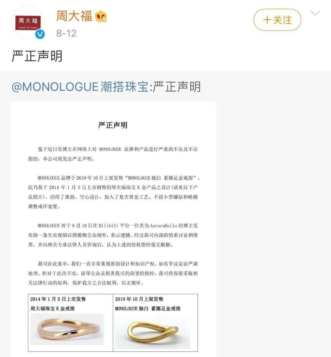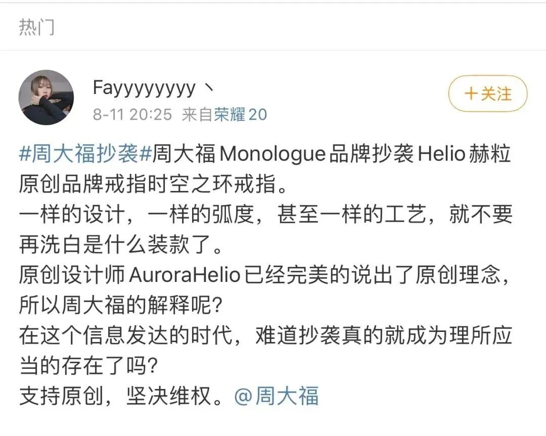 独立设计珠宝品牌HELIO赫粒的珠宝设计师Aurora,在B站发布了一个标题为《心态炸了!!周大福旗下品牌又一次侵权抄袭独立设计师作品,这次抄的一毛一样!》的视频。