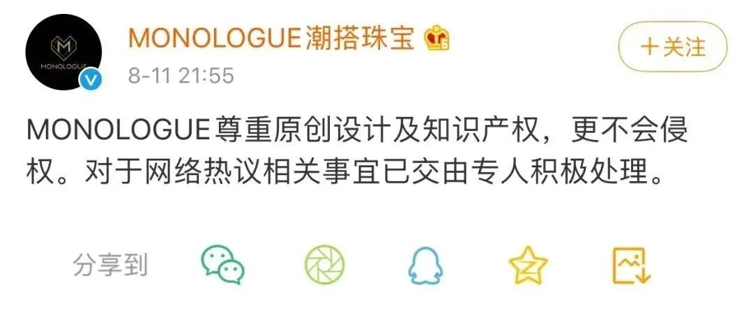 随后,涉事品牌MONOLOGUE官微表示品牌“尊重原创设计及知识产权,更不会侵权”,目前此事已交由专人积极处理。