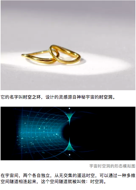 据设计师称,戒指的不规则曲率是根据虫洞形成时原有的轨迹变化设计的,时空之环从外观造型的设计到材质工艺的选择都为了“虫洞”这一主题所服务。