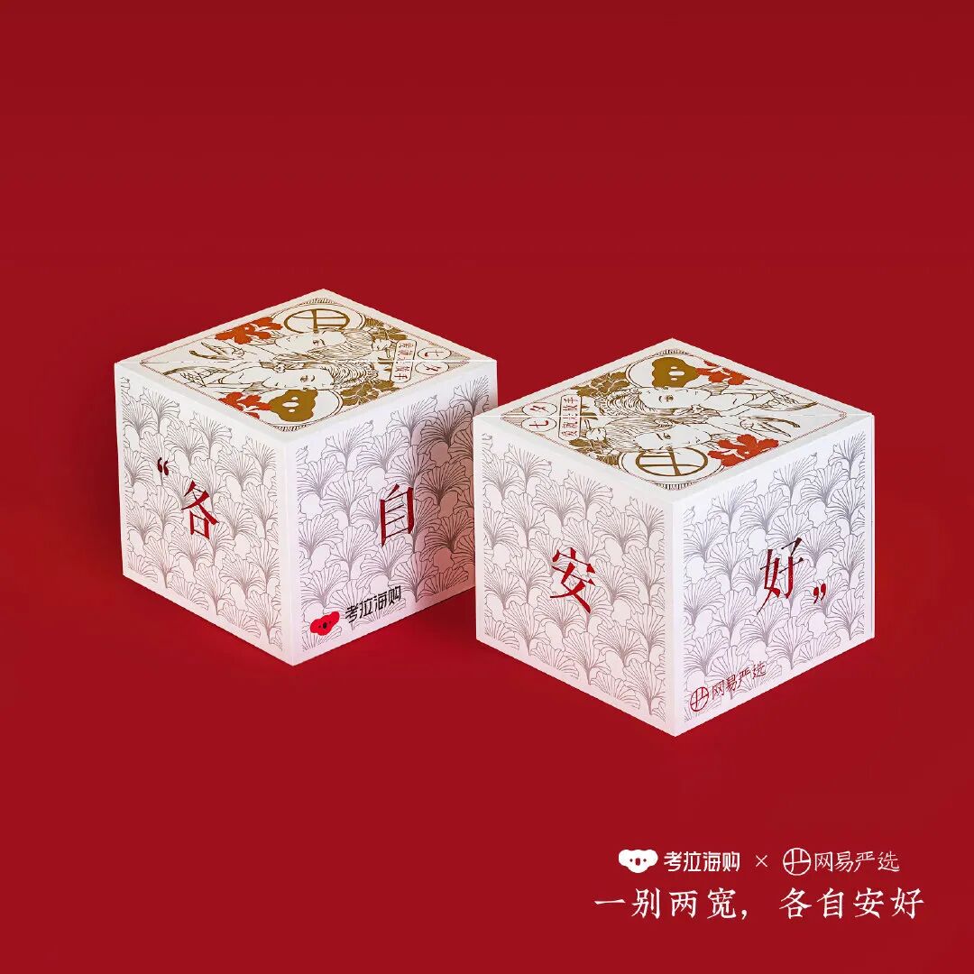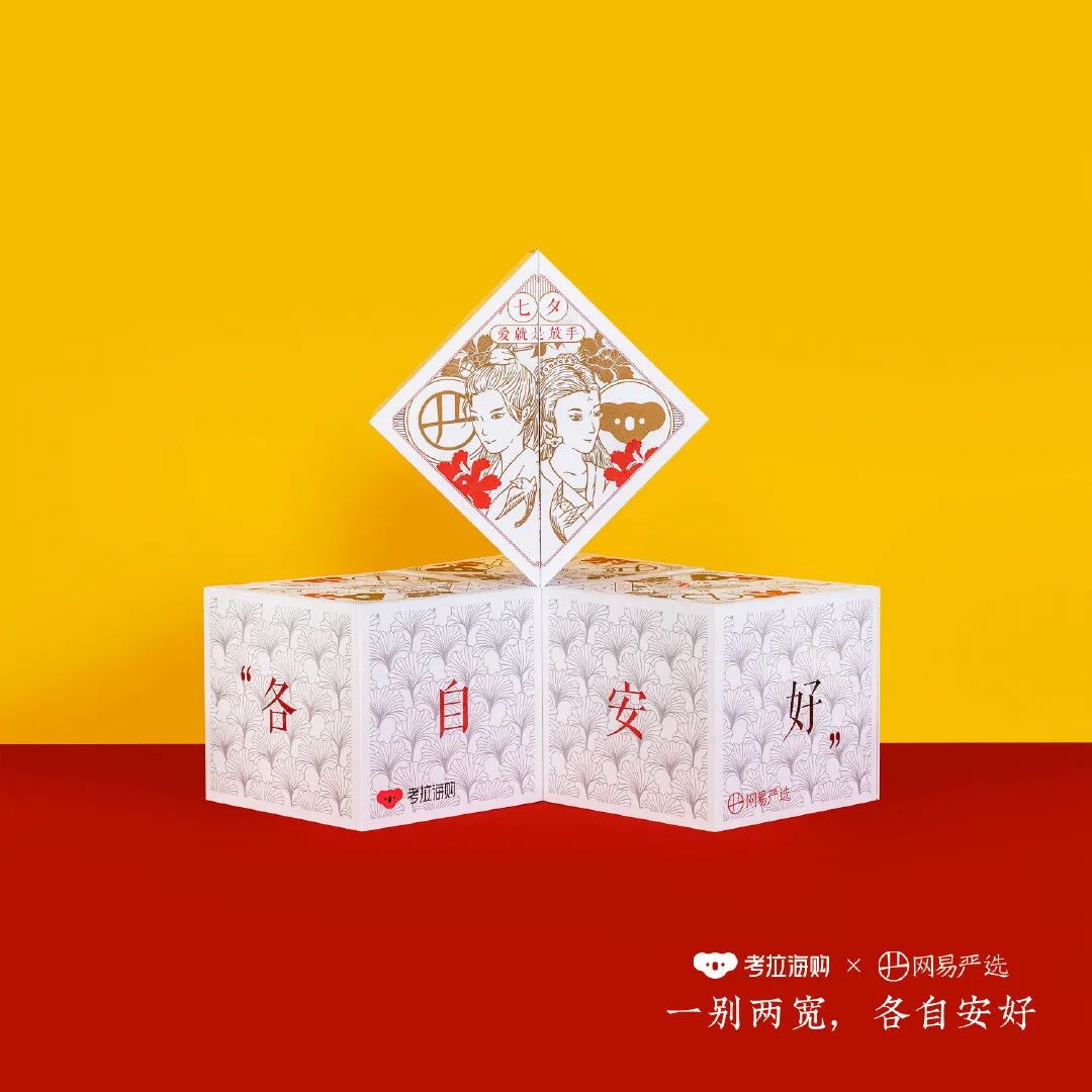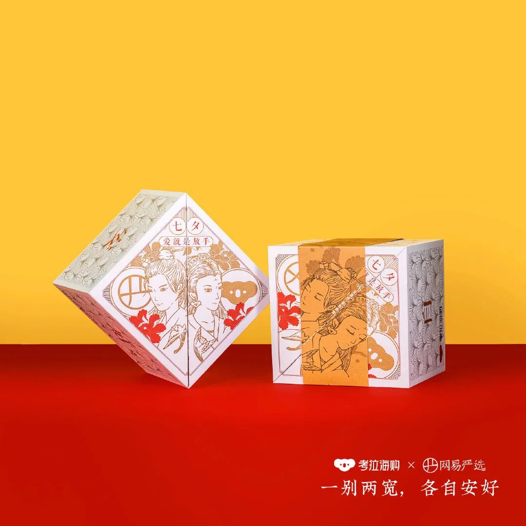 看到短片的最后才发现,网易严选和考拉海购心机满满,表面上是庆祝分手快乐,实则是预热神秘事物的上线。治愈系的插画,人格化的品牌形象,再加上腻歪的情话,成就了这支可爱又暖心的短片。网易严选和考拉借势分手一周年的营销的热点,结合七夕的节点话题,把双方打造成“分手快乐的组合”,顺势植入活动上线信息,堪称创意十足。要是你对短片中严选送考拉的礼物念念不忘,那就说明你成功被套路了!果不其然,接下来网易严选和考拉海购官宣七夕限定款“爱就是放手”礼盒。“爱就是放手”作为分手一周年的见证,也代表满满的分手仪式感。据说礼盒包含了前男友面膜和网易严选购物卡,而且考拉表示礼盒只送不卖!透过海报可以看到,礼盒从概念到设计都颇有心思,礼盒概念主打“一别两宽,各自安好”,延续了短片中金句“有一种爱,是放手”的含义,象征着“彼此分别但又各自安好的祝福”。在礼盒包装上,可以看到一男一女的古风人物,代表着严选和考拉品牌,而在礼盒的四个面上,分别印着“各、自、安、好”四个字;此外,礼盒颠覆了常规向上翻的开启模式,而是设计成了对角线的打开形式。
