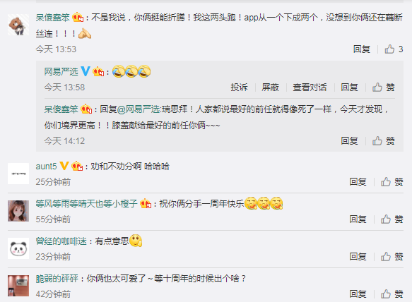 听说被分手之后,最好的报复方式就是“过得比对方好”?考拉就实力表演一回情侣复仇记姿势:特地内涵一下阿里的食堂“真香”,这就是传说中的“别人家的食堂”吧!不仅如此,阿里动物园、网易家族的兄dei集美们也来凑热闹,围观这对虐狗CP的微博留言区,献上一波吃瓜文案,每一句都有梗。再次为分手复合话题“添油加醋”,不知不觉考拉海购和网易严选的留言区,变成大型土味情话现场。