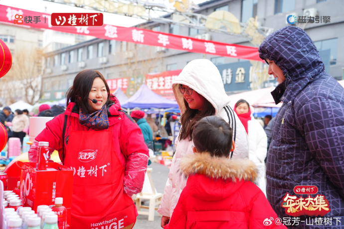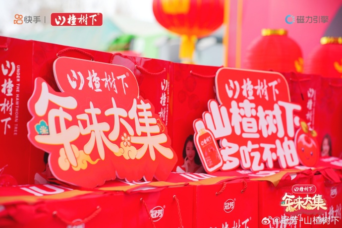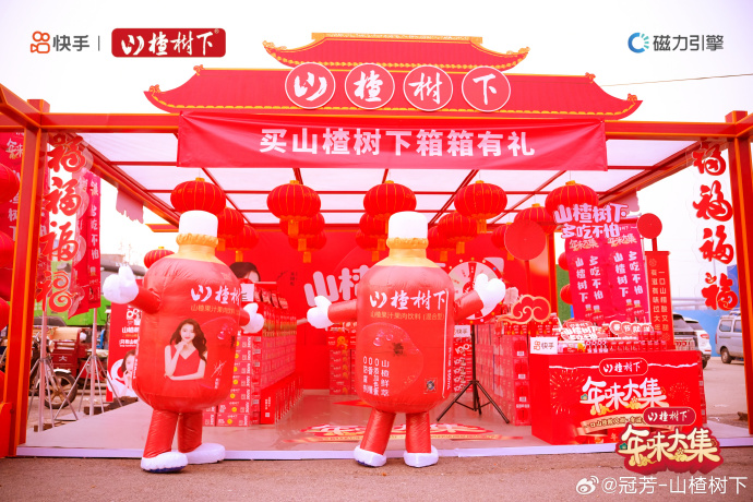 在传统集市的浓浓年味氛围里,活动不仅助推传统年俗文化传播和地方文旅资源出圈,也为品牌创造了丰富多元的线上线下营销场景。快手与山楂树下在现场联合搭建品牌摊位,以山楂树下产品包装的红色为主色调,让“喝山楂树下,欢喜过大年”更加具象化。除产品展示、口播等方式之外,活动通过山楂树下人偶全程陪逛泊里大集、品牌信息深度植入四大年味任务、达人直播间挂车同款产品等花式玩法,助力山楂树下实现新春营销声量和销量双收。