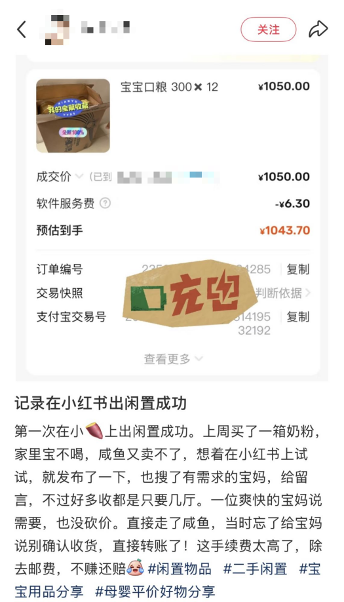 具体来看,根据观察,对于100元以下的低价商品,同城的买卖双方更倾向于选择自提。比如前文提到的徐清颜,她90%的闲置物品都是通过这种方式完成交易的。而对于500元以上的高价商品,出于安全考虑,买卖双方通常会选择通过闲鱼等专业平台进行交易。例如,有宝妈在小红书上发布奶粉转让信息后,最终选择在闲鱼以1050元的价格成交。当然,也有部分用户会直接要求必须通过平台交易,否则就取消买卖。