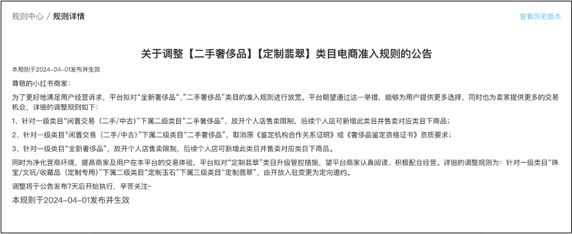 值得注意的是,此前小红书还要求二手奢侈品类目商家具备《鉴定机构合作关系证明》或《奢侈品鉴定资格证书》等专业资质,但在2024年4月1日已取消该项要求。但从搜索结果来看,小红书上的二手奢侈品商家并不活跃,且大部分二奢商家发布笔记的目的,都是为线下门店引流。