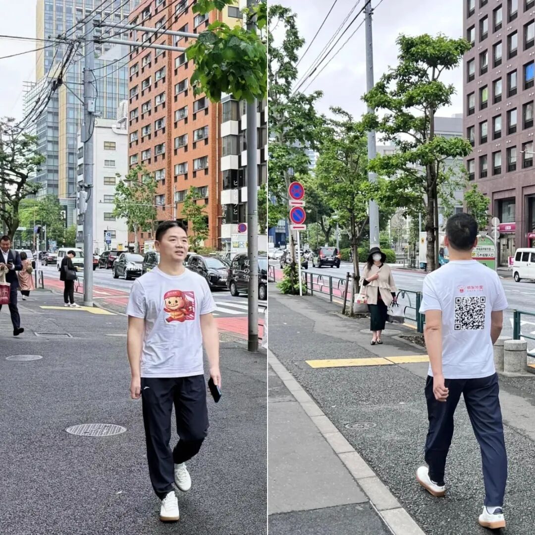 5月10日,身穿联名T恤的刘强东在日本东京街头被偶遇。其衣服正面为猪猪侠背外卖箱的图案,而背面则印有京东外卖的二维码,刘强东因此被网友戏称为“行走的广告牌”。