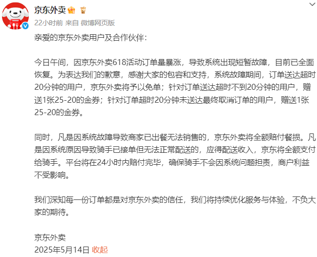 4月22日午高峰,京东外卖因订单暴增首次出现系统崩溃,用户下单后商家收不到订单、骑手端信息同步异常,官方紧急启动“超时20分钟免单+赠券”的补偿方案。