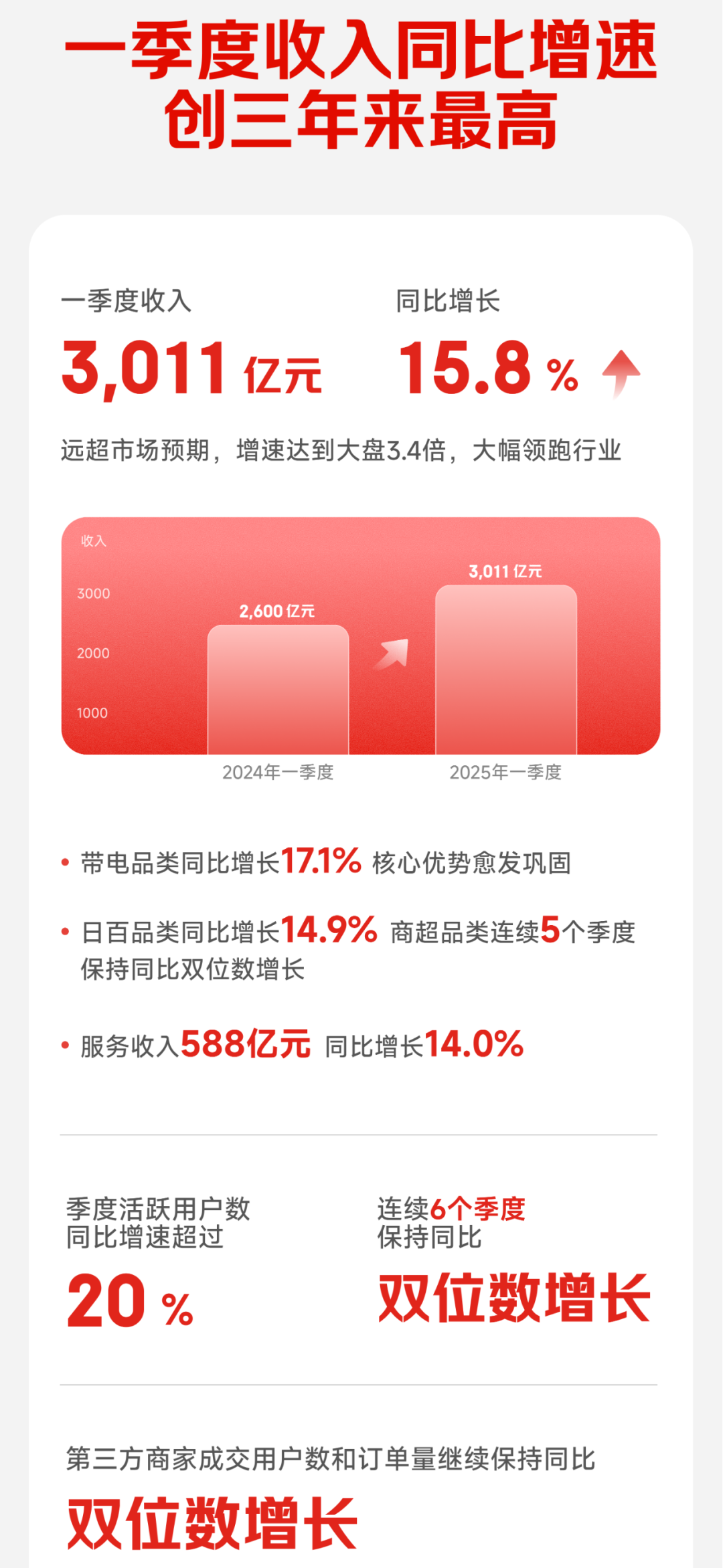 5月13日,京东集团发布了2025年一季度财报,交出了一份营收3011亿元、同比增长15.8%的亮眼答卷。