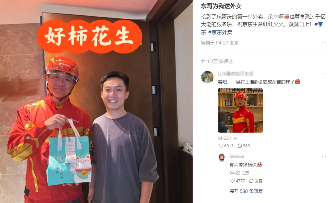 4月21日,他身着红黄配色的京东外卖工服在北京街头亲自送外卖,还请骑手吃火锅,深入一线了解情况;卡餐卡出的迷茫表情直接等上热搜,当网友调侃其工服配色“撞衫猪猪侠”时,迅速推动京东与猪猪侠联名,再次成功破圈。