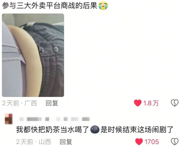 网友们的各种调侃道出了这场外卖大战的全民参与感。从“25-20”的神券到“1分钱奶茶”,消费者在低价狂欢中享受着薅羊毛的快感。