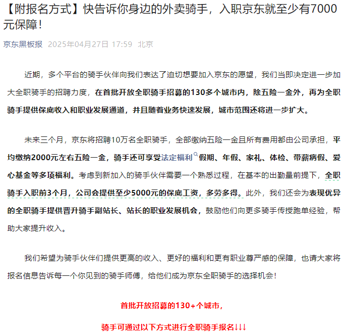 有业内人士指出,美团日均7000万单的配送依赖于300万日活跃骑手,其人均日送单量约为23单;而京东若想实现2000万单的稳定履约,至少需要50万以上的活跃骑手。也就是说,刘强东的“10万全职骑手”计划也仅是杯水车薪。