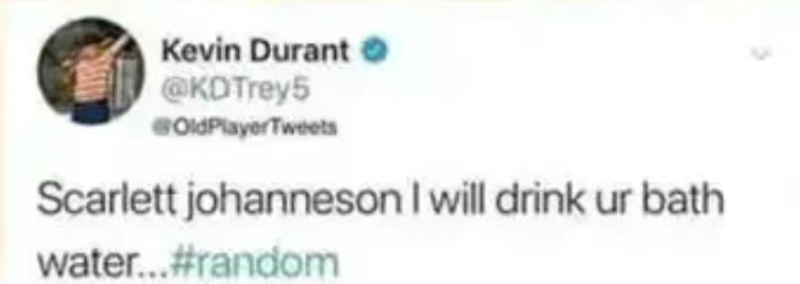 原来“xx的洗澡水”有两个经典出处,一个多年前的NBA球星杜兰特,因为疯狂迷恋“黑寡妇”斯嘉丽,公然发文“想喝她的洗澡水”。