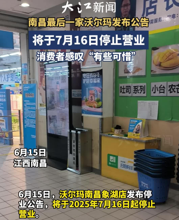 就在昨日(6月15日),有媒体报道,沃尔玛在南昌最后一家门店——象湖店宣布将于7月16日闭店。