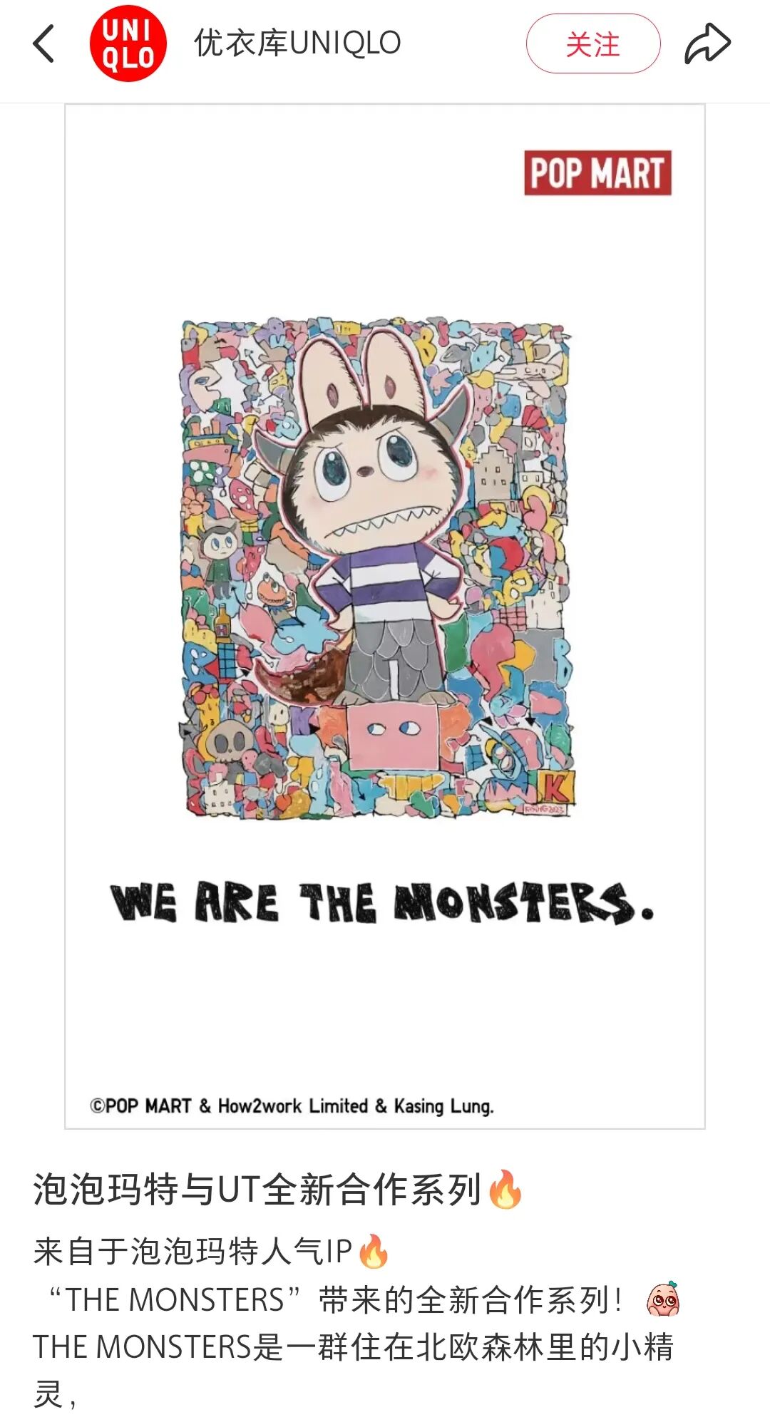 这并非优衣库第一次与泡泡玛特合作,早在2022年4月,优衣库就曾与“THE MONSTERS”系列合作过,但当时LABUBU还未大火,还是那只北欧森林里的“普通”小精灵,在潮玩圈的知名度并不算高。