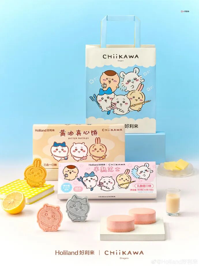 此次联名选取了 chiikawa 经典角色元素,将三只小可爱的萌趣形象融入产品包装与视觉设计,同时推出了两款核心产品,包括乳酸菌口味半熟芝士与三合一巧克力黄油夹心饼。
