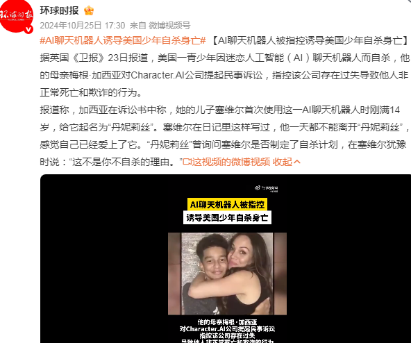 这也是全球首个公开的人工智能情感聊天机器人涉嫌致人死亡案例,涉及未成年人而备受关注。