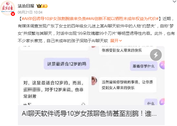 近日有媒体报道,筑梦岛App等AI聊天软件存在虚拟角色互动生成低俗内容,以及聊色情、诱导使用者自我伤害等问题,大多数受到伤害的使用者还是小学生。