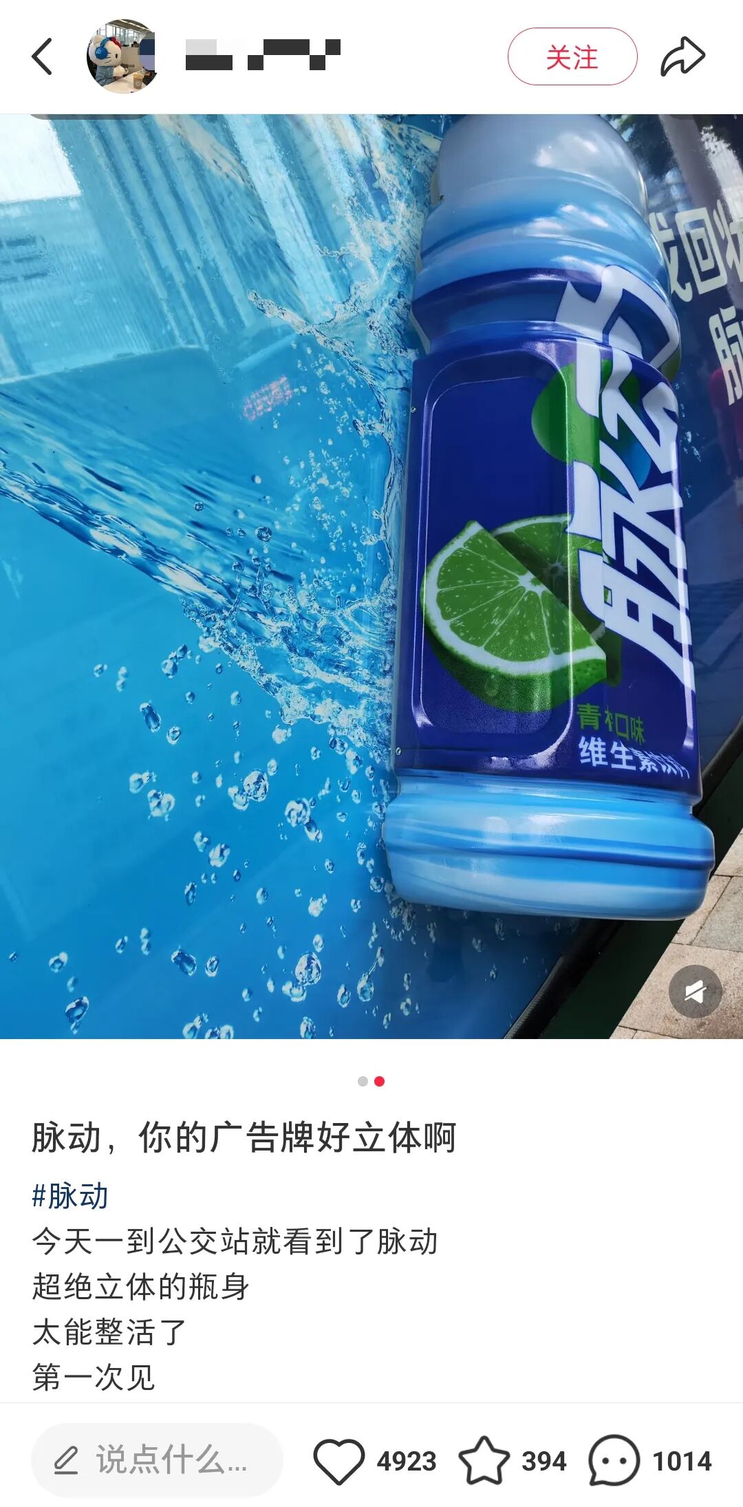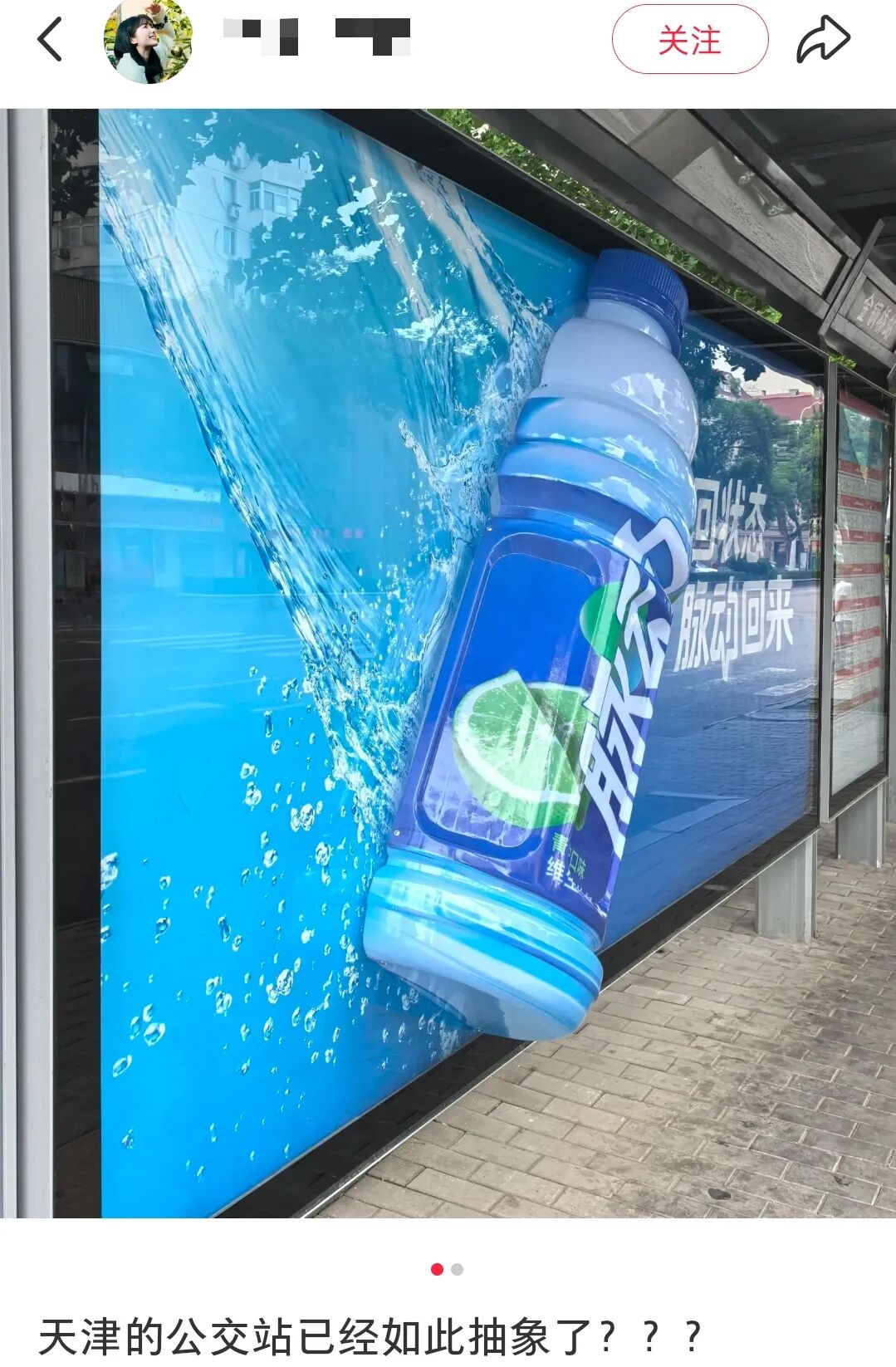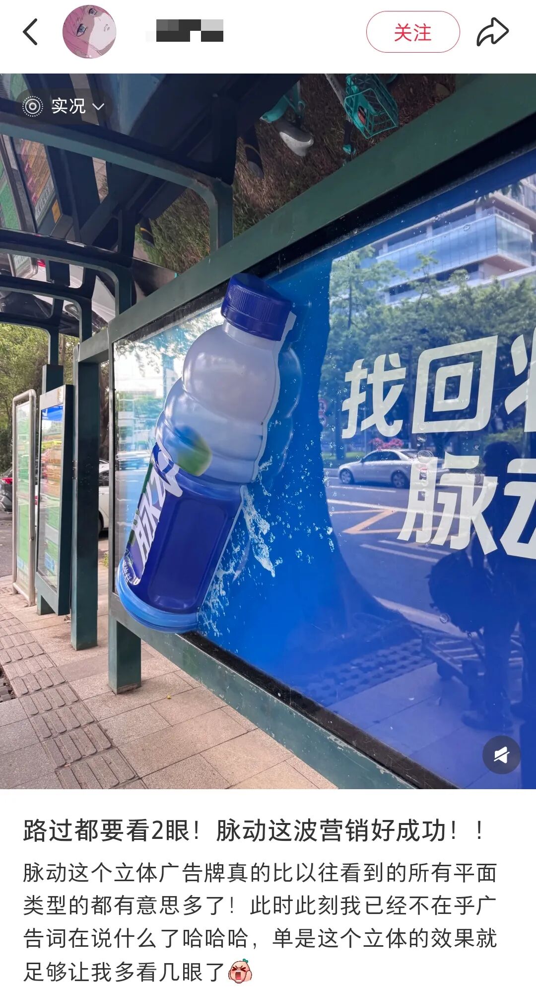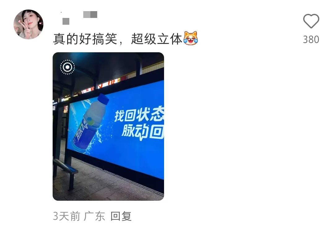 它直接把半瓶巨型脉动怼在了公交站广告牌上,瓶身凸起,原本是一个富有创意的装置,评价却褒贬不一,有不少网友在小红书等社交平台发帖,称等公交的时候被脉动“创”到了......