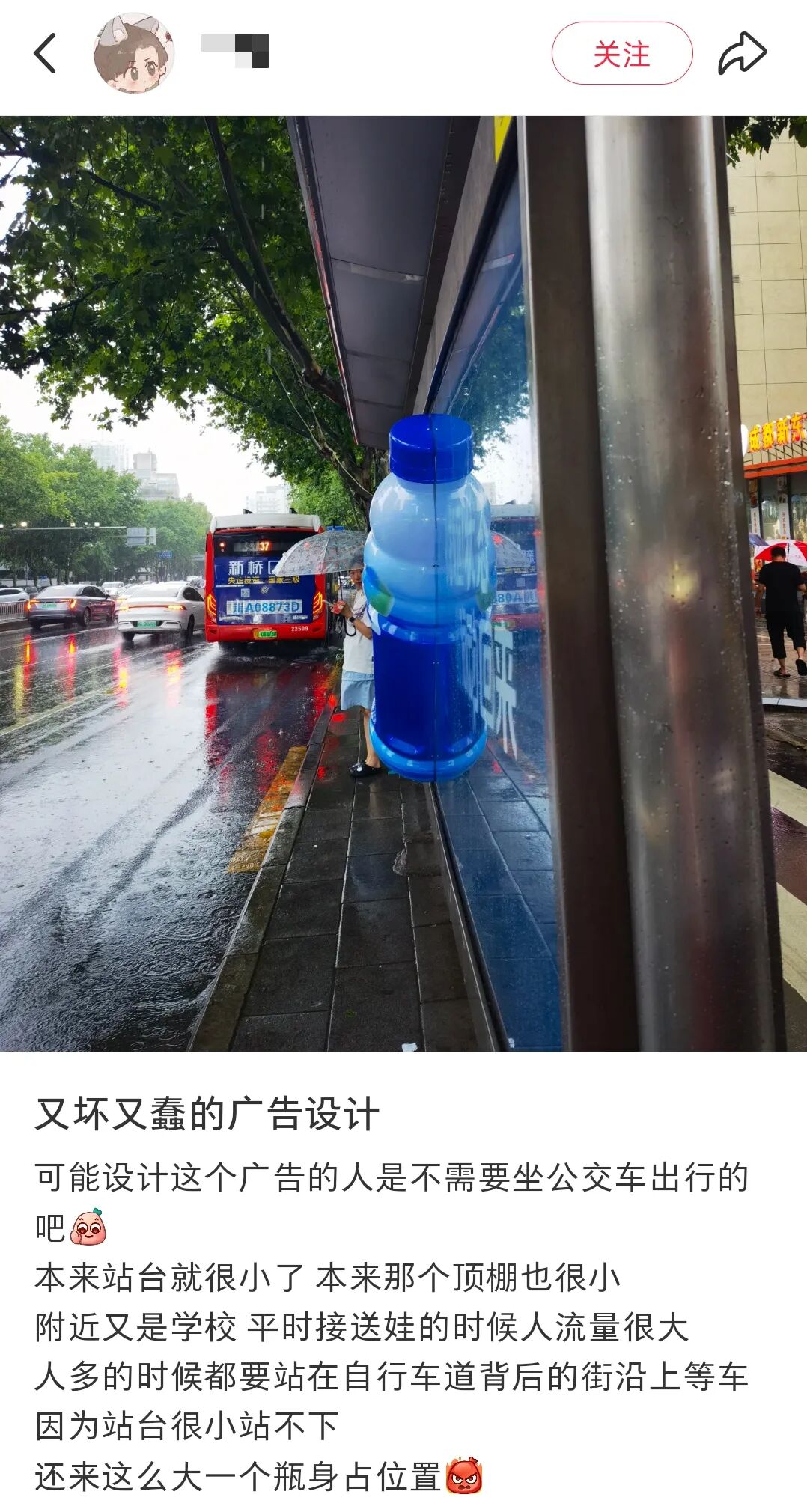 网友更吐槽到,本来就小的避雨空间还被占领,脉动不会觉得这广告很有创意吧?