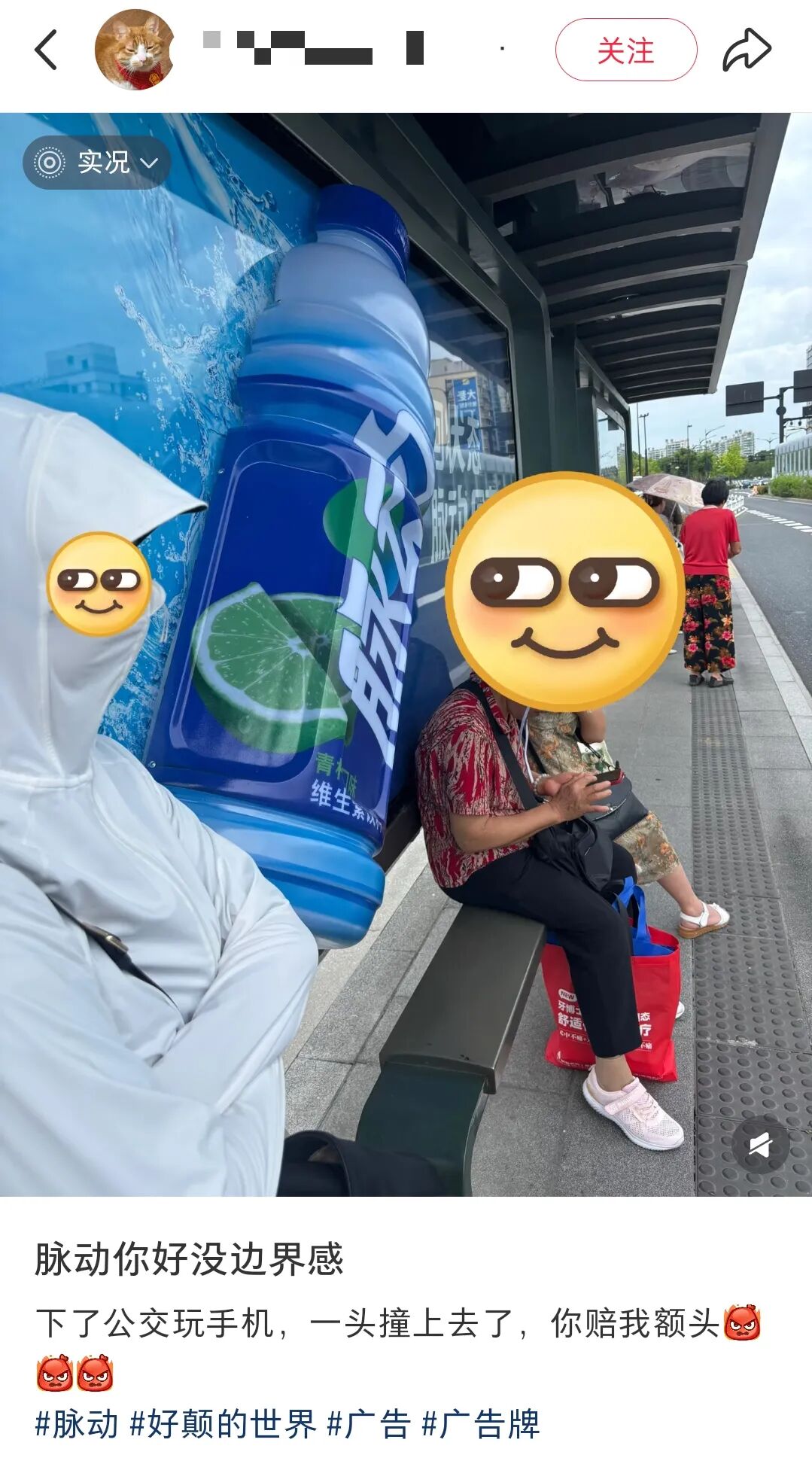 为什么呢?因为不少公交站广告牌下方刚好是一排座椅。脉动这组立体广告在全国超20个城市同时投放,凸起的瓶身广告,难免有撞上休息区的地方。