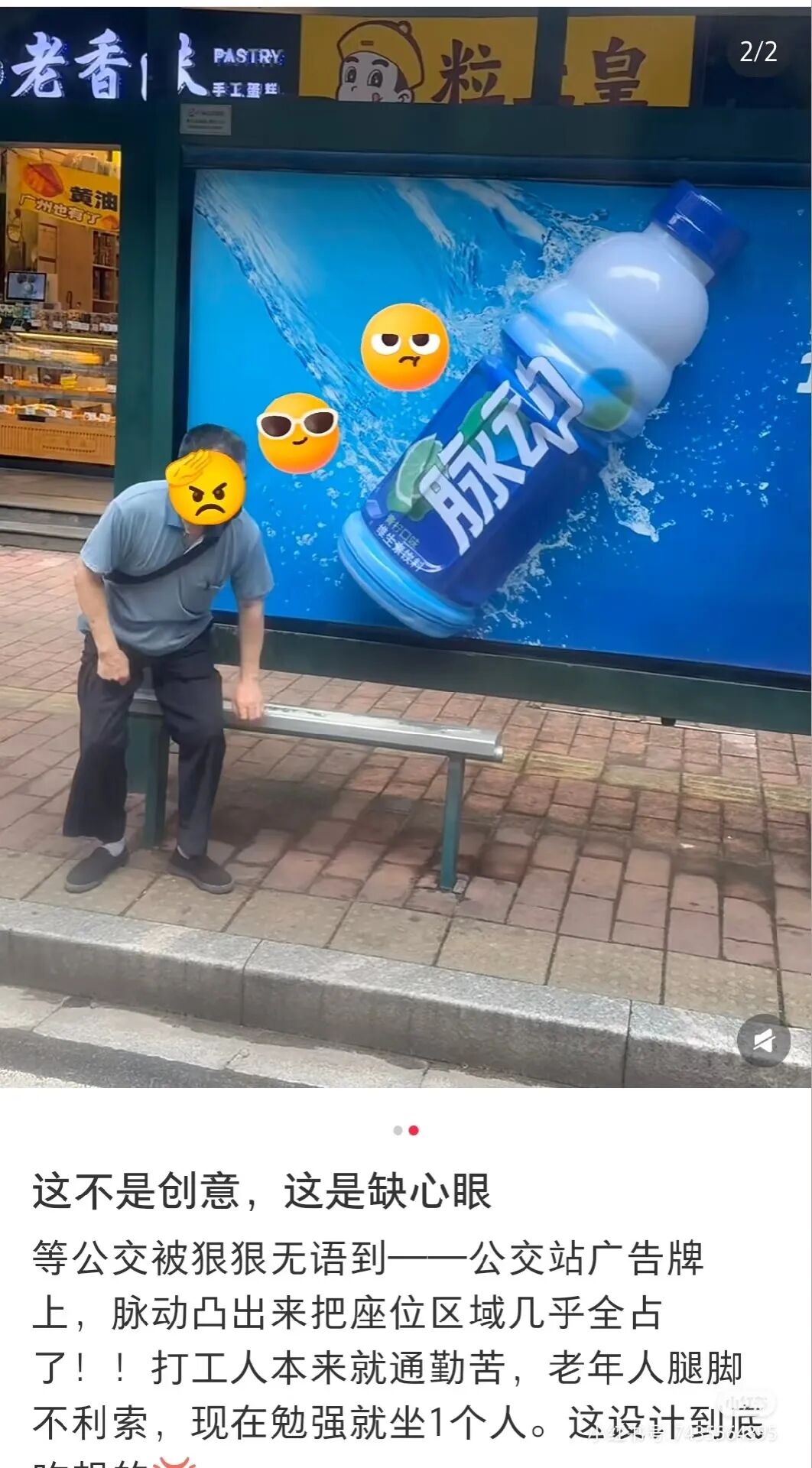 打工人通勤累成狗,好不容易抢到公交站的长椅,结果一屁股坐下去,发现半个座位被脉动"霸占"。更惨的是,有些城市的候车区本就狭窄,凸出的瓶身直接让能坐3-4人的长椅,变成"1人VIP专座"。