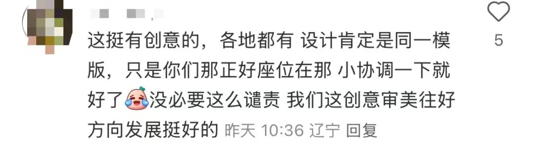 也有网友表示,创意是好的,没必要谴责,估计是全国各地用的统一模板,有的公交站座位刚好就在瓶身前面,只需要在线下执行的时候稍微改进一下就好了。比如把瓶身挪动一下,避开座位区就不影响市民休息。