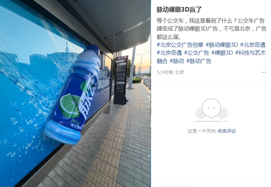 最近,脉动在北京、广州、深圳、成都、重庆、济南、石家庄、西安等多地公交站台投放了一个3D立体广告装置。