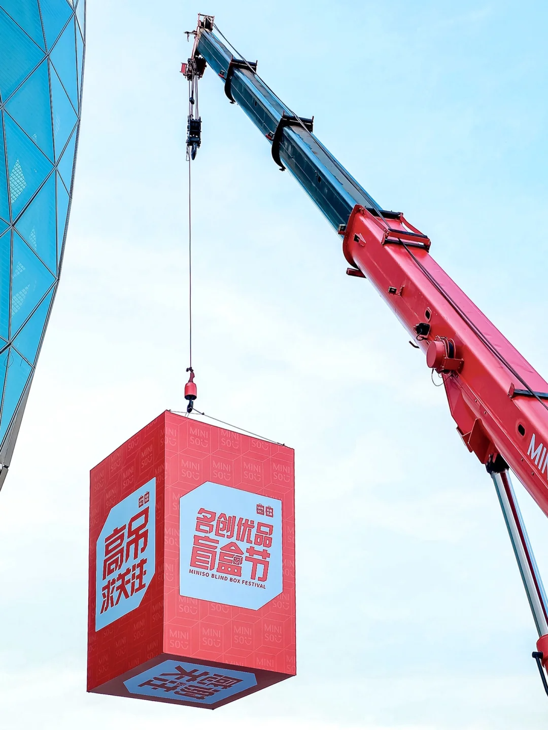 名创优品盲盒节,将大型盲盒吊起来“高吊求关注”。