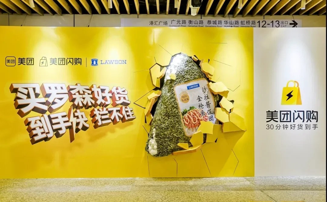 通过这样的视觉冲击,具象化诠释了美团闪购“30分钟好货到手“的平台卖点,凸显美团闪购到手快,拦不住。也通过多样化产品暗示了平台品类的齐全。这样具有视觉冲击力的广告引发路人疯狂拍照,社交媒体刷屏。