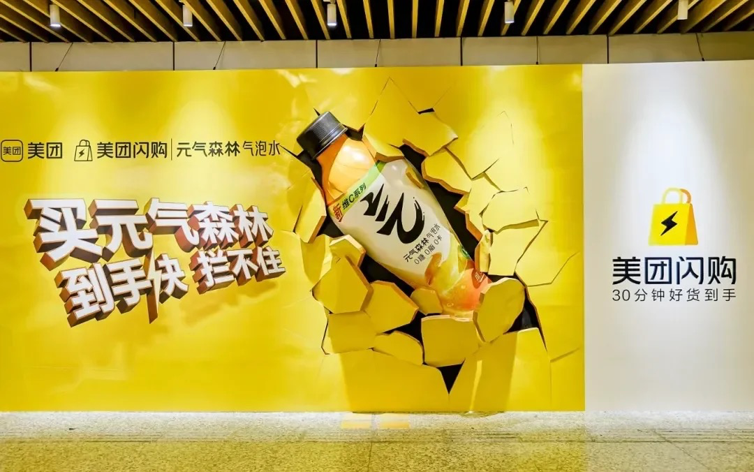 而在更早之前,美团闪购联合一众品牌,在上海徐家汇地铁站投放了一组“炸裂”广告,不仅有破墙而出的元气森林气泡水。
