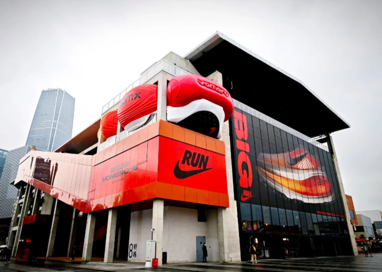 迈柔系列是耐克新推出的缓震跑鞋,主打缓震、柔软,采用这种“塞”进大楼的视觉设计,简单粗暴传递产品的柔软好穿。