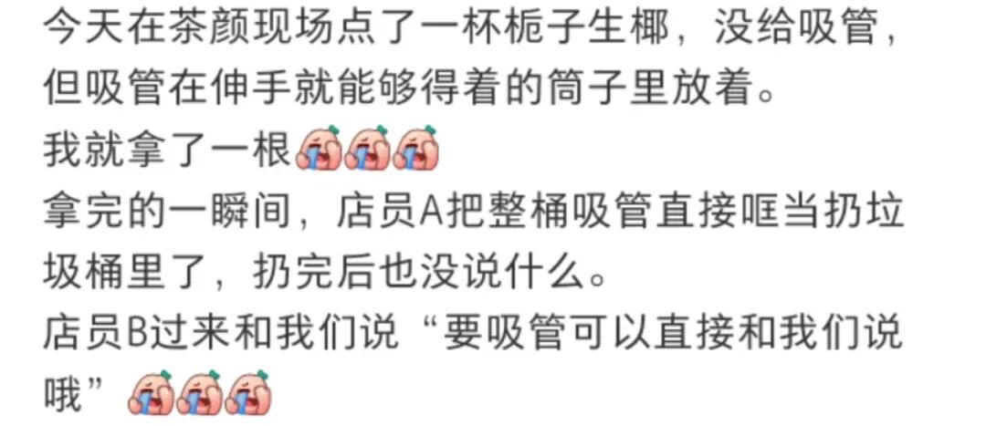 比如茶颜悦色规定,门店的吸管是不能顾客自取的,如果需要,可以告知店员,店员会用镊子夹给顾客。