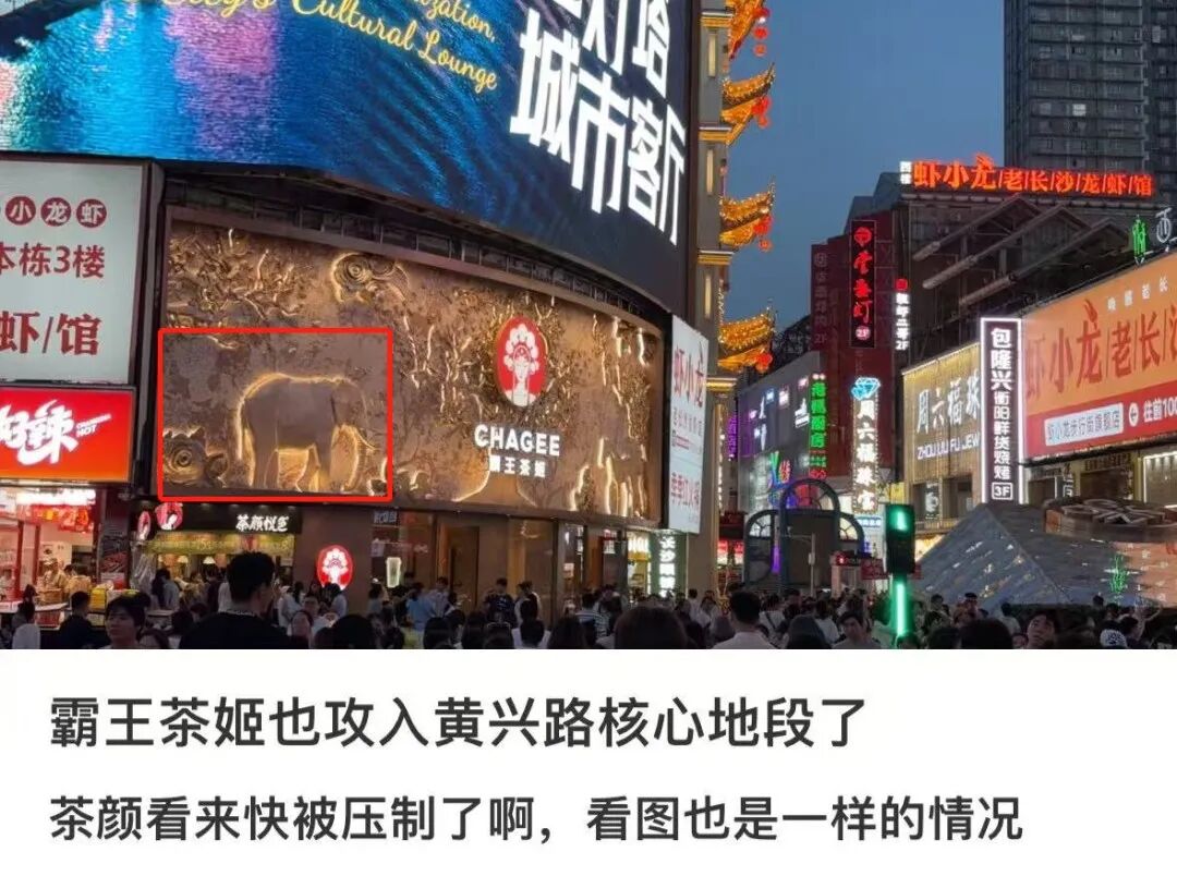 而且,不知道是有意的还是有意的呢,在茶颜门店的正上方,茶姬设计了一头大象,正好把茶颜踩在了脚下。如果此前的“杜甫骑脸”属于视觉误差的话,这次霸王茶姬真就是物理意义上的“踩”了。