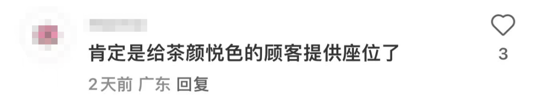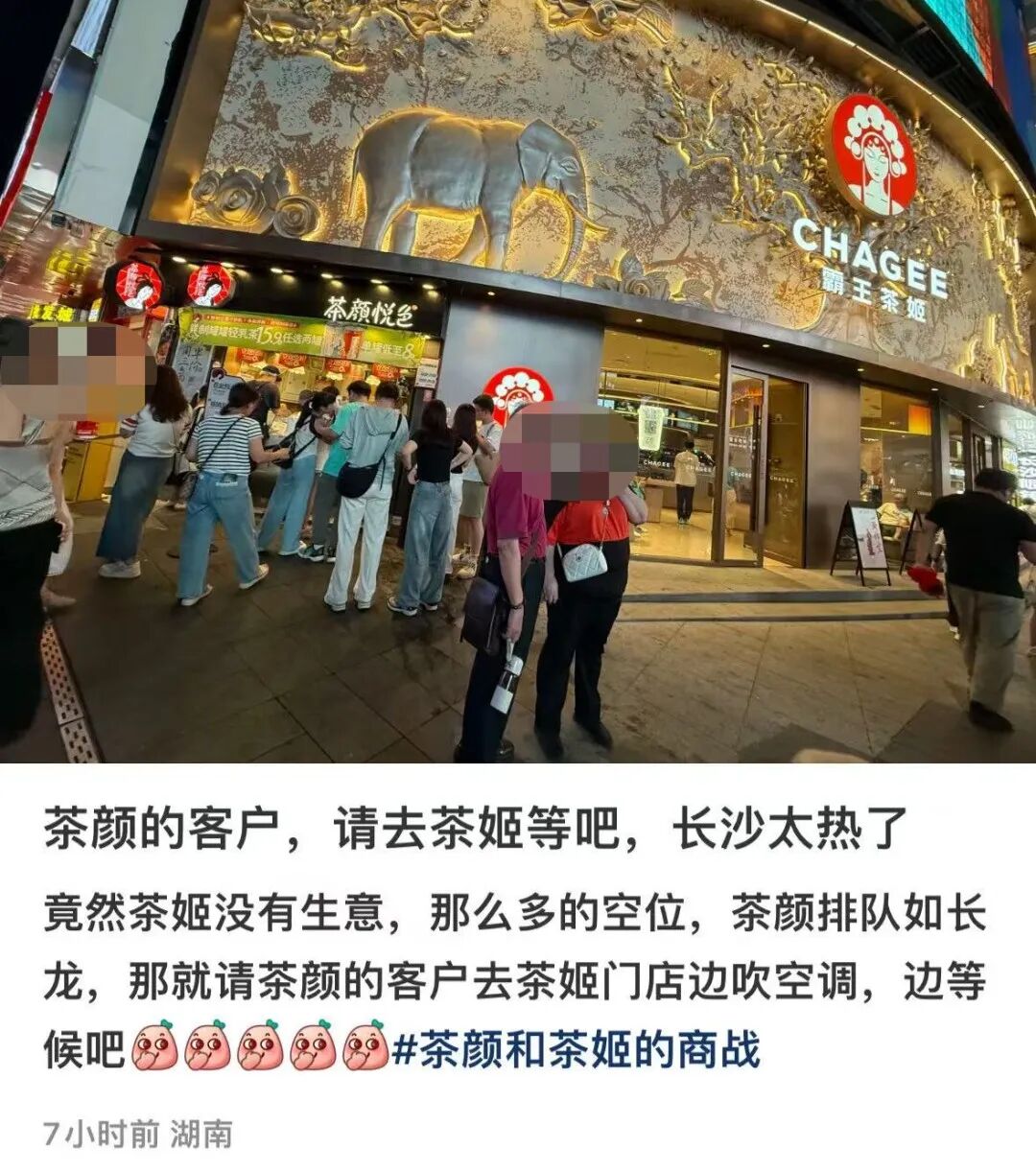 有人认为,这是霸王茶姬在为茶颜悦色的顾客提供免费座位。毕竟长沙的天气那么热,在茶颜下完单可以到茶姬边吹空调边喝奶茶,多惬意啊!