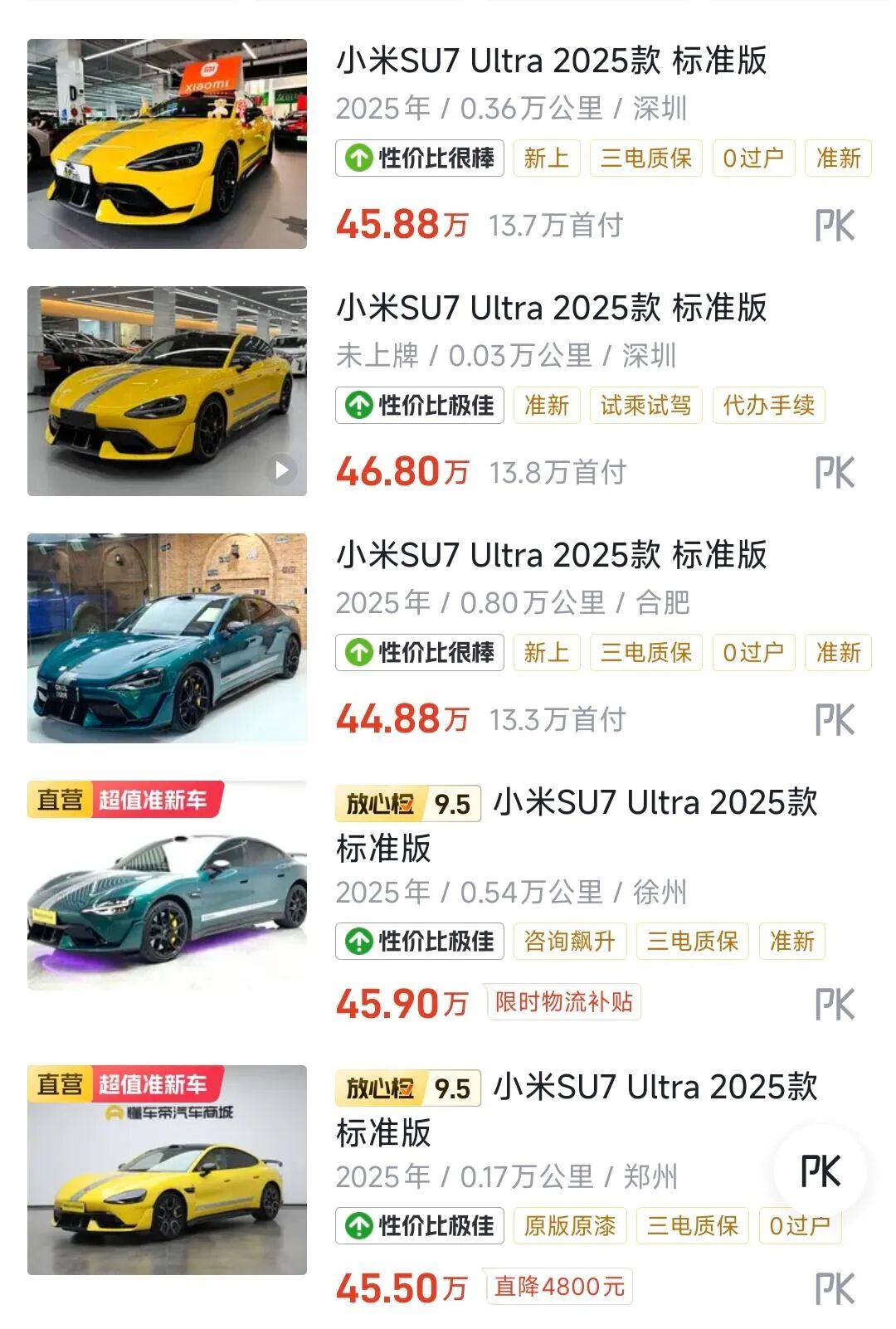 根据多家二手车交易平台数据显示,SU7 Ultra的二手价已经跌至46万元,而在几个月前,这款车还因为供不应求被黄牛炒到接近65万。