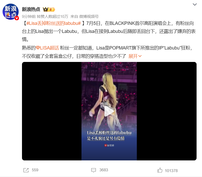 随着演唱会的歌曲、舞蹈、互动等内容在社交平台上曝光后,随之而来的却是一条震惊全网的热搜——Lisa丢掉了粉丝送的labubu。