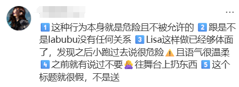 并且Lisa在将玩偶扔回去之后,还劝诫了粉丝,这样做很危险,不要往舞台上扔东西,甚至在官方发布的声明里也有明令禁止过该行为。