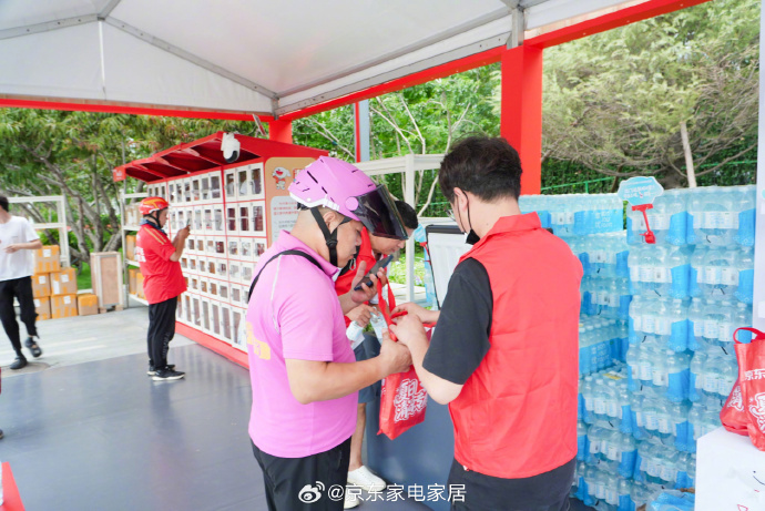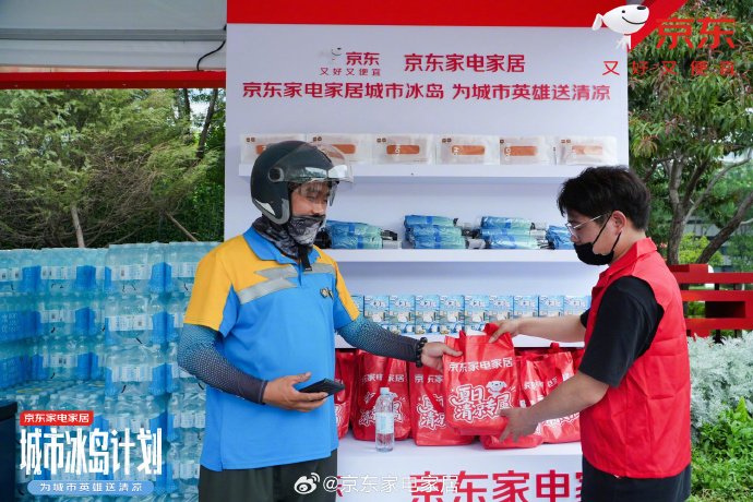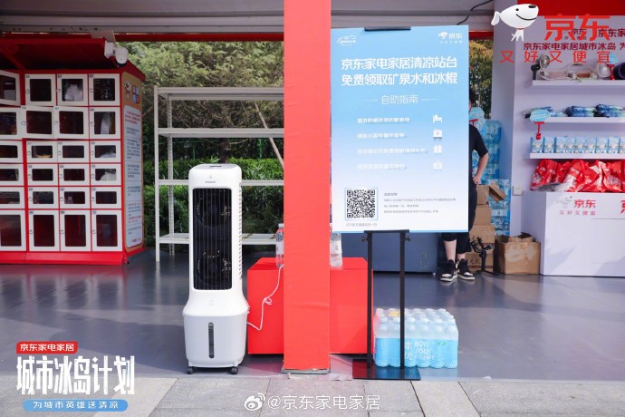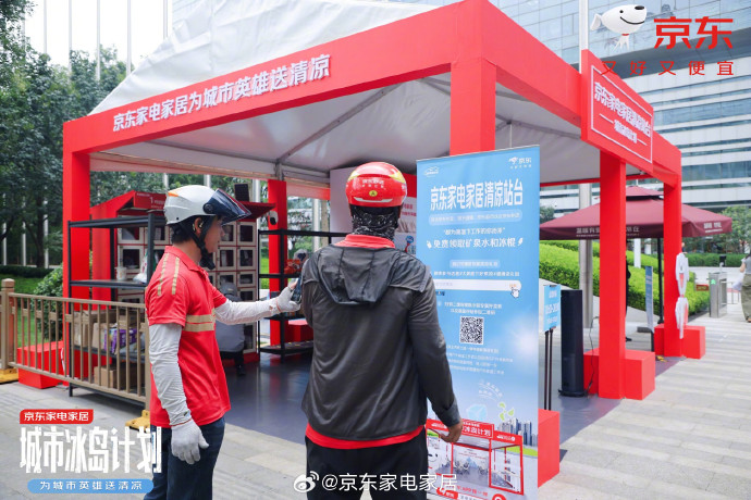 不仅如此,京东家电家居还在11座城市搭建了「清凉站台」,欢迎所有奔忙在烈日下的城市英雄和户外工作者们进来歇歇脚,感受一份专属的清凉关怀。