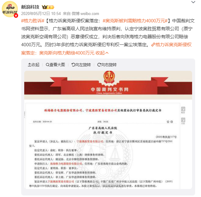 2015年,格力首次将奥克斯告上法庭,指控其侵犯3项实用新型专利,胜诉获赔230万元。