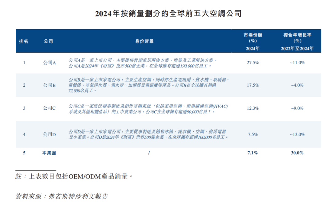 根据弗若斯特沙利文的数据,2024年奥克斯以7.1%的市场份额,成功跻身全球第五大空调供应商。